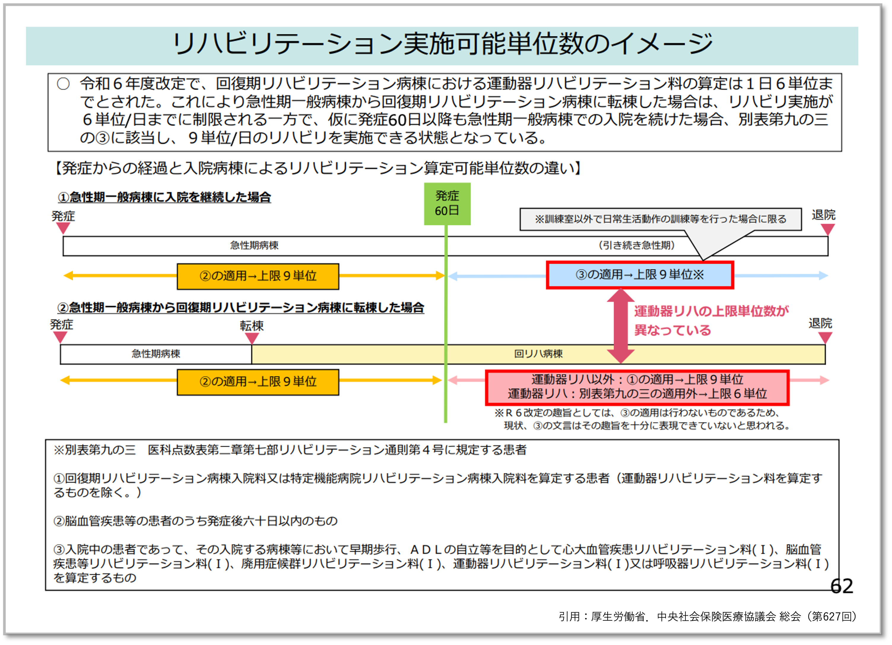 一方で、急性期病棟に60日以降も入院した場合、早期歩行、ADLの自立等を目的としてリハビリテーション料(Ⅰ)を算定する患者として、1日9単位のリハビリを実施できる現状があります。