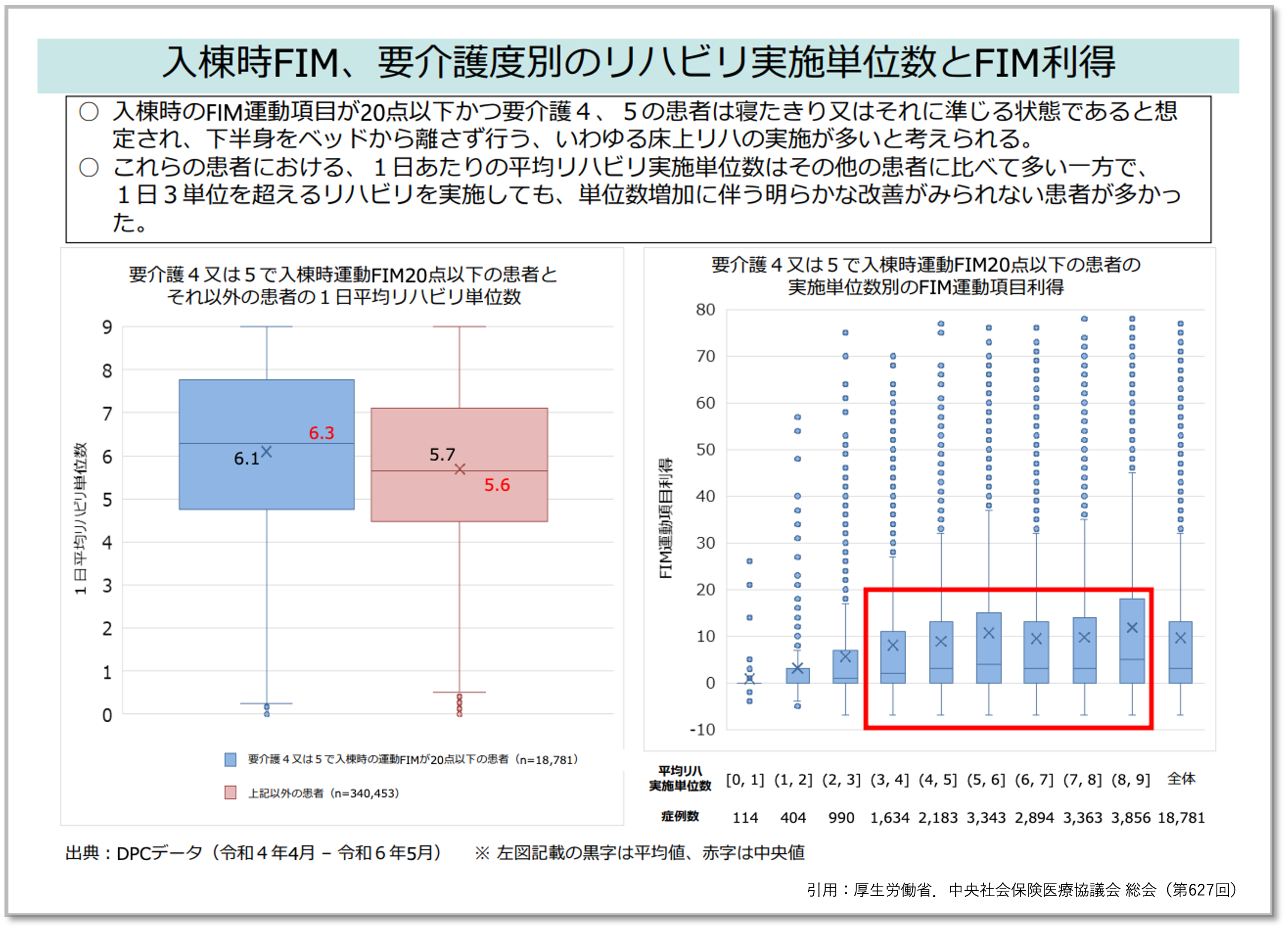 また、床上リハの実施が多いと想定される「入棟時のFIM運動項目が20点以下かつ要介護4または5の患者(いずれも重度の機能障害が想定される層)」では、平均実施単位数は多かったにもかかわらず、1日3単位(60分)を超えるリハビリを実施しても、単位数増加に伴う明らかな改善が見られなかったことが、厚生労働省よりデータで示されました。