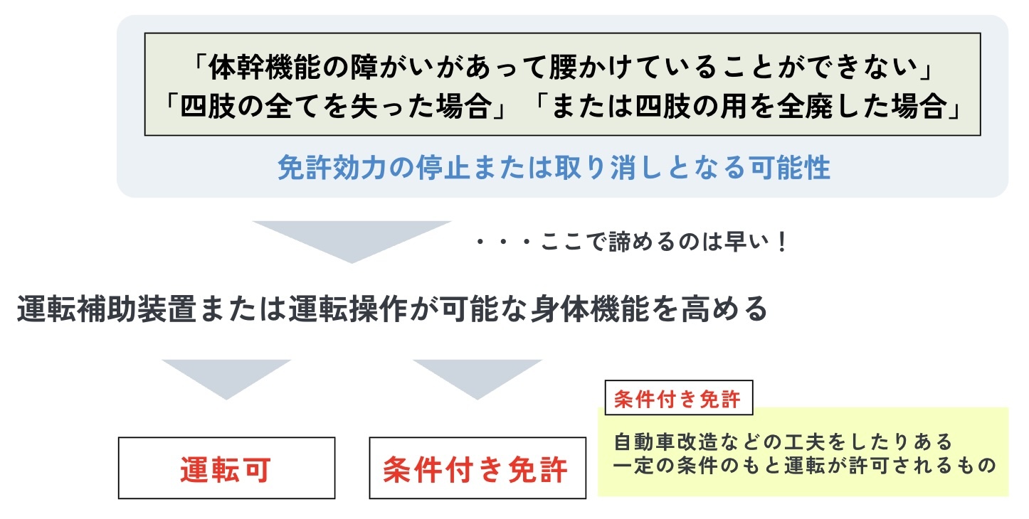 そのため、補助手段を使用するか、使用しない場合も運転操作が可能な身体能力を有することが求められています。