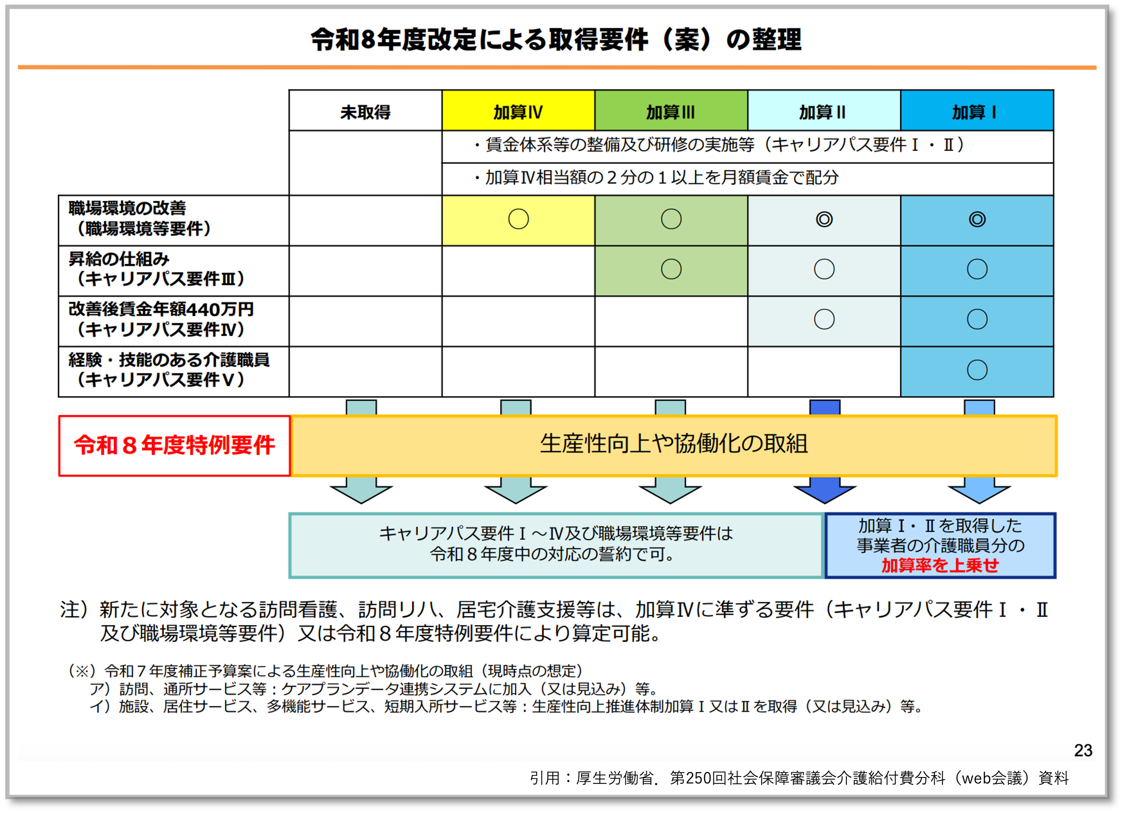 その際、当該要件の整備には一定の期間を要することを踏まえた配慮措置や、現行の介護職員等処遇改善加算の対象となっているサービスにおいて設けられる生産性向上や協働化に取り組む事業所・施設に対する配慮措置を踏まえた措置を講じることが適当である。