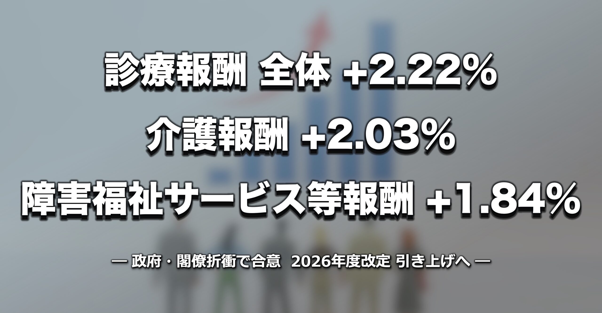 政府は、2026年度の診療報酬改定を全体2.22%、介護報酬改定は2.03%、障害福祉サービス等報酬は1.84%、それぞれ引き上げる方針を固め、片山さつき財務相と上野賢一郎厚生労働相の閣僚折衝で合意しました。