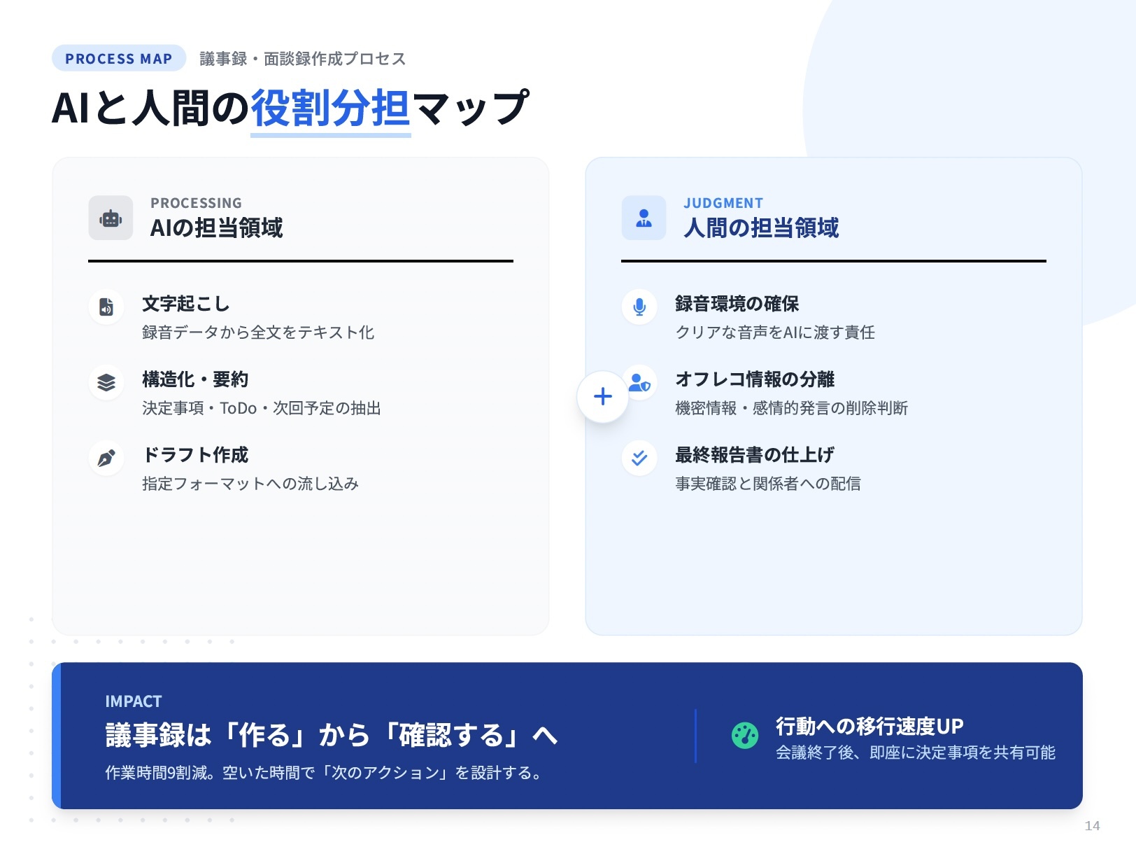 人間は、AIがまとめた内容をもとに不要な内容は削除したり、言い換えをするなど微調整と事実確認をして関係者へ配布するという役割です。