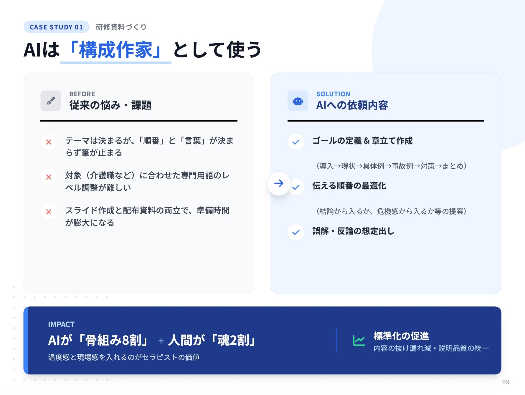 AIが作った「8割の骨組み」に、私たちが「2割の魂(現場感)」を入れて共作することができます。