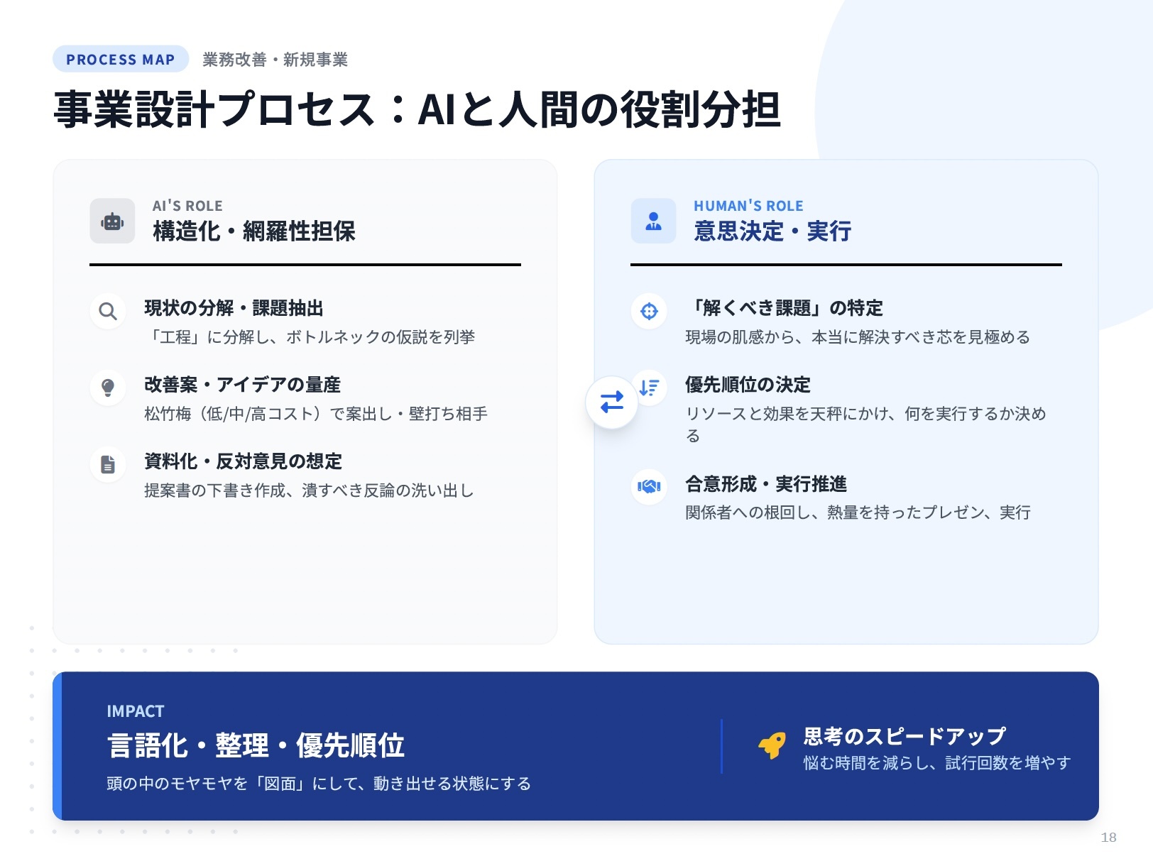 AIと壁打ちしながら導いた内容をさらにAIに資料化してもらって、人間が熱量を持って実行していくことが可能になります。