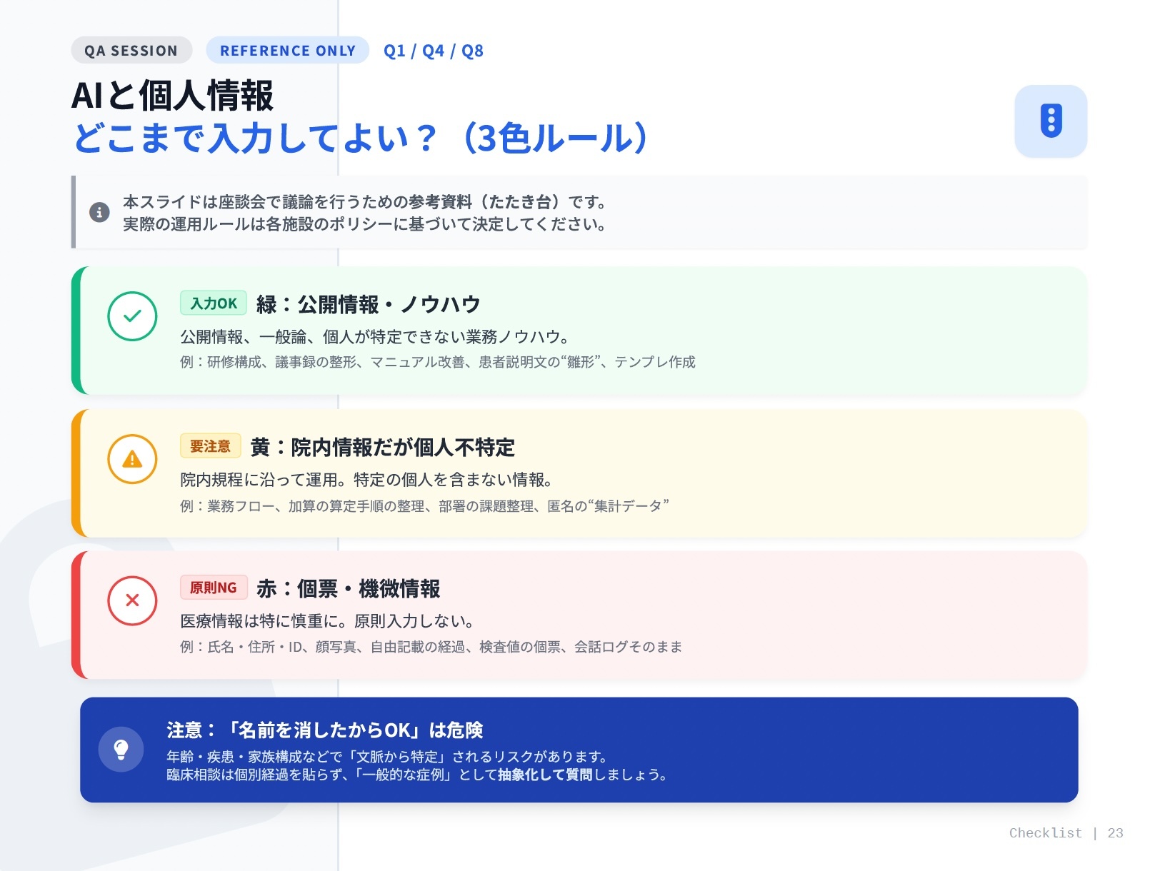 基本的に、患者さんの指名や住所など具体的な個人情報を直接入力することは避け、匿名化することが必須です。