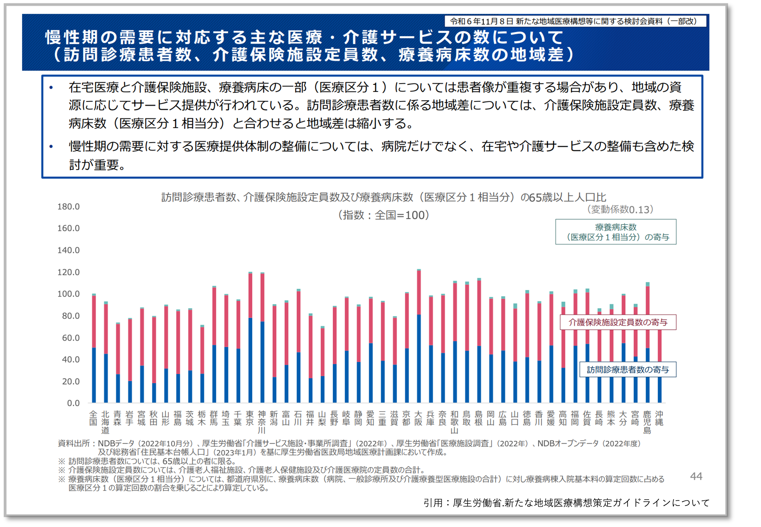 新たな構想では、これらの課題を解決するため、構想区域単位等の範囲で、都道府県、市町村、医療関係者、介護関係者等が複数のデータ(療養病床の病床数、介護保険施設の定員数、在宅医療の提供状況など)を統合して検討し、協議を行うことが求められています。