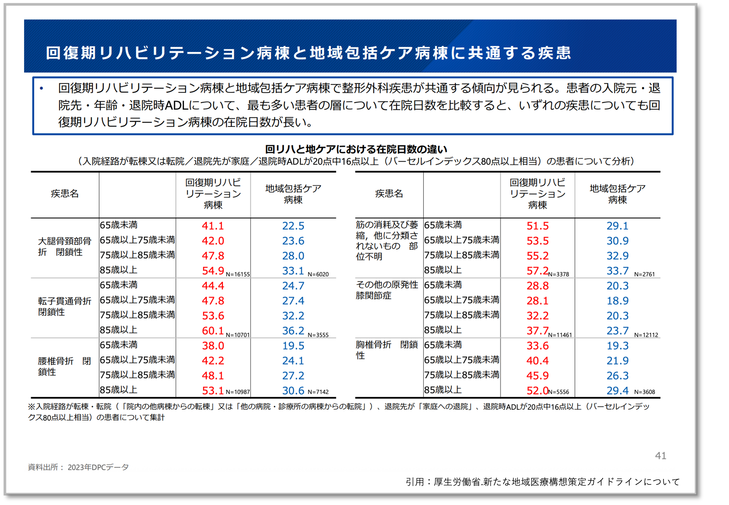 本検討会の第5、6回では、「回復期リハビリテーション病棟は、脳血管疾患の割合が減少し、整形外科疾患の割合が上昇している。また、同じ整形外科疾患であっても地域包括ケア病棟と比較して回復期リハ病棟の方が平均在院日数が長い」という実態が共有され、あり方が議論されてきました。