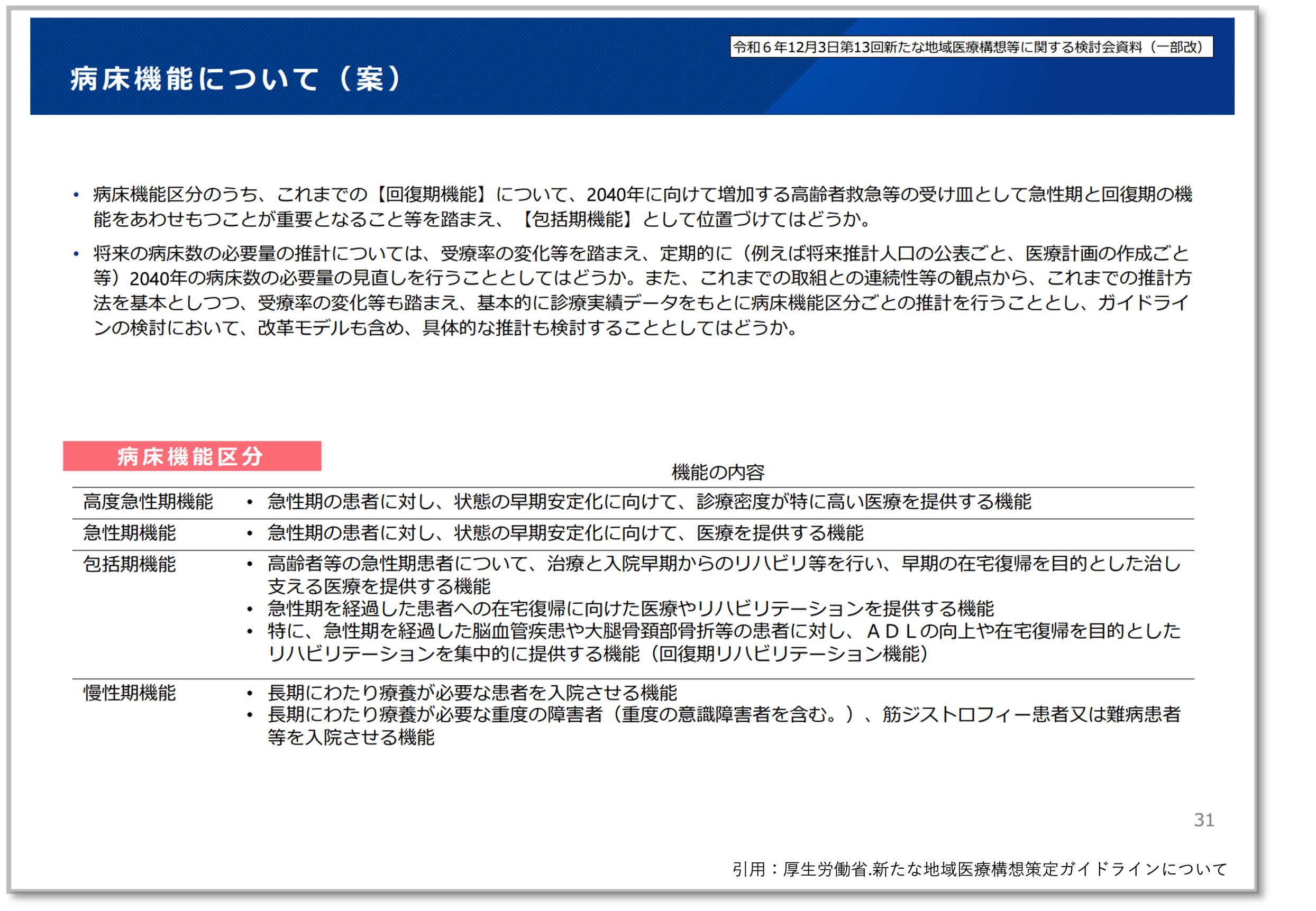 なお、病床の機能区分においては、高齢者増加に伴い病床の不足を鑑みて、従来の「回復期機能」が見直され、新たに「包括期機能」として位置づけられています。