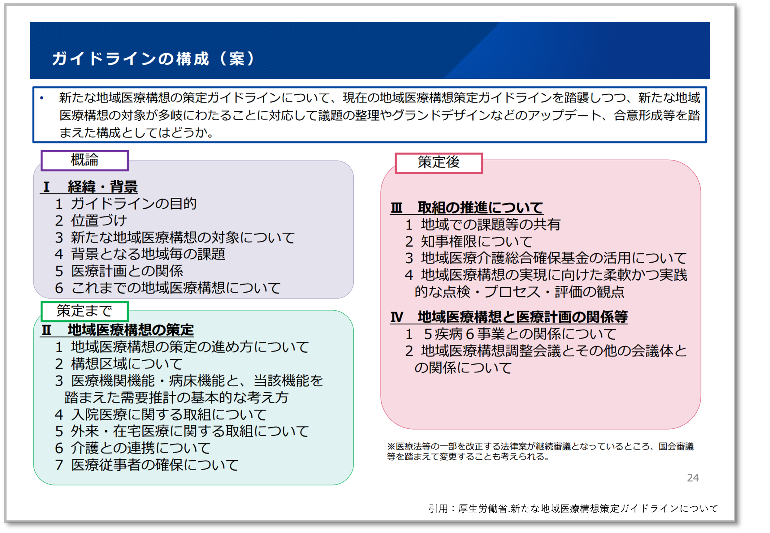 新たな地域医療構想のガイドラインは、前回の枠組みを踏まえつつ、入院だけでなく外来・在宅・介護との連携や医療従事者確保などを含めて内容を広げる方針です。