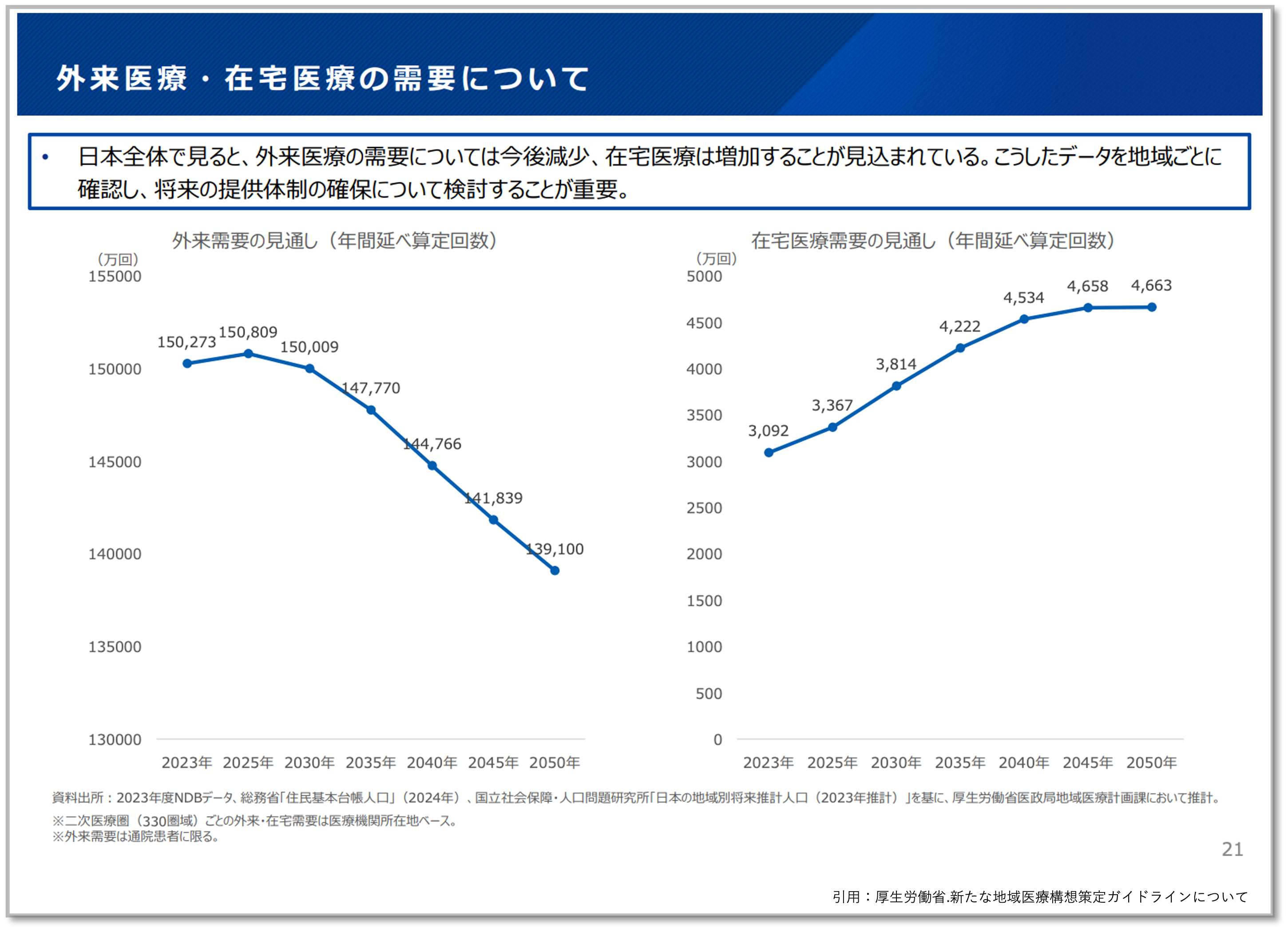日本全体で見ると、外来医療の需要は今後減少する一方、在宅医療の需要は増加が見込まれています。特に、在宅医療は2040年に向けて約1.5倍に増加する見通しです。