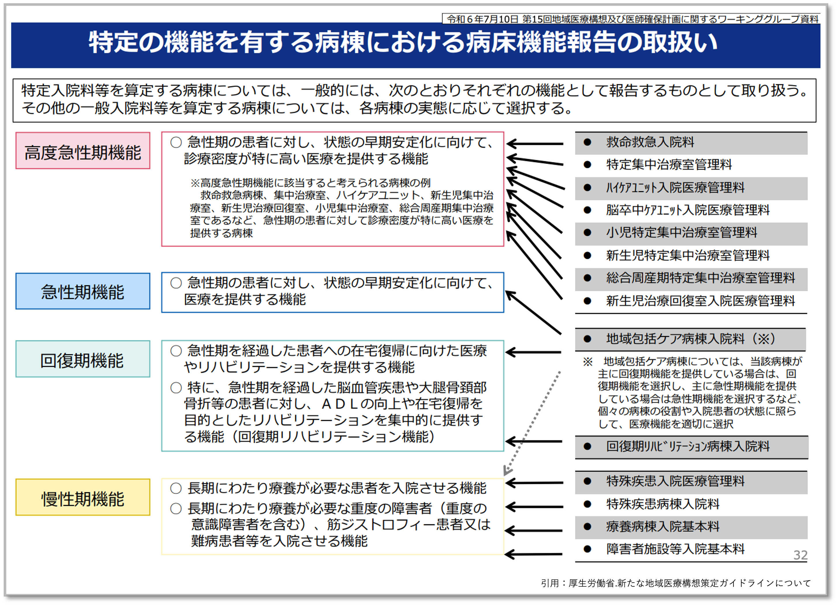 こうした状況を踏まえ、今回の検討会では各入院料と病床機能区分の対応関係を明確化する目安が示されました。