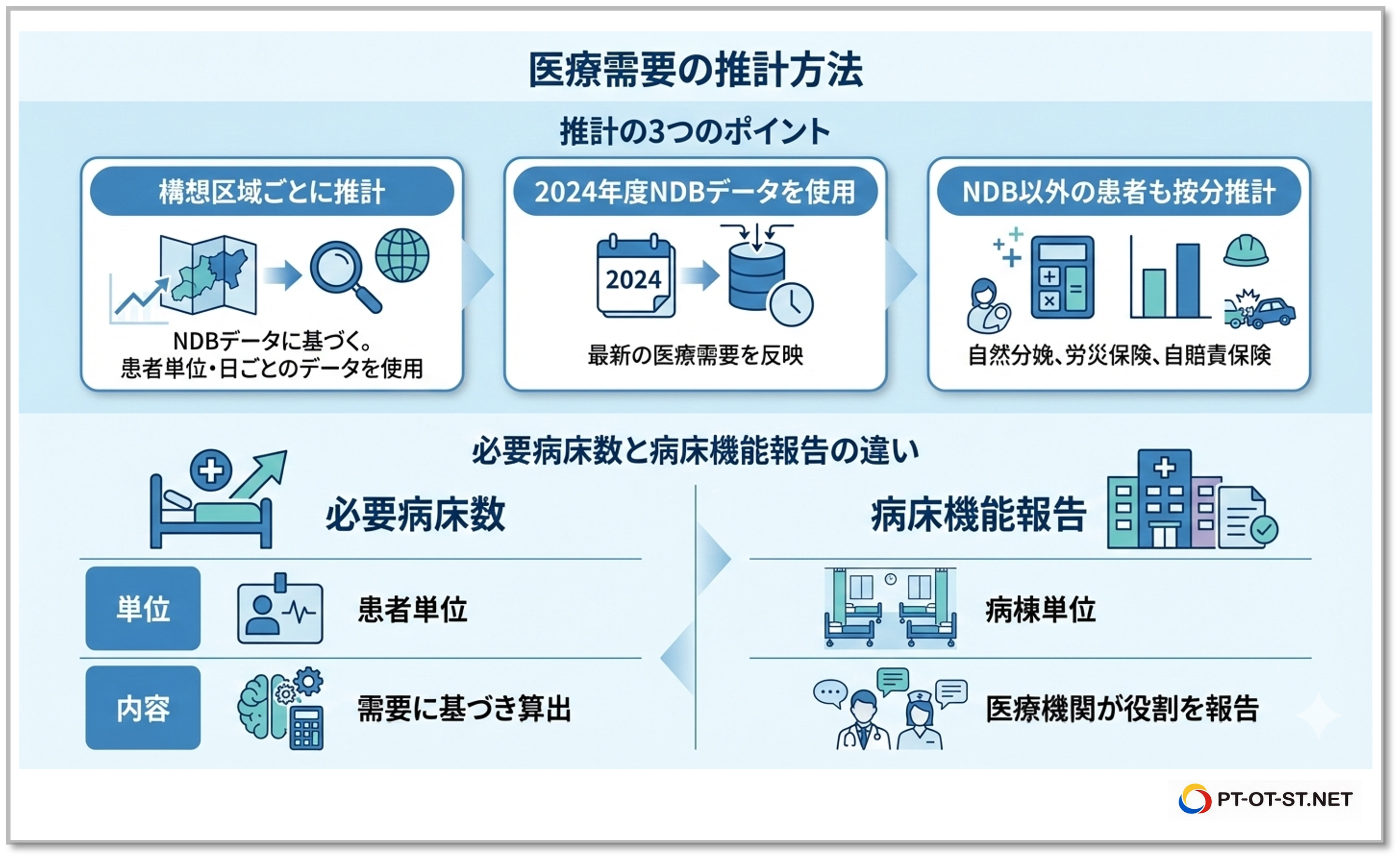 必要病床数は、患者単位で需要に基づき算出されます。一方、病床機能報告は、医療機関が病棟ごとに役割を報告するものです。