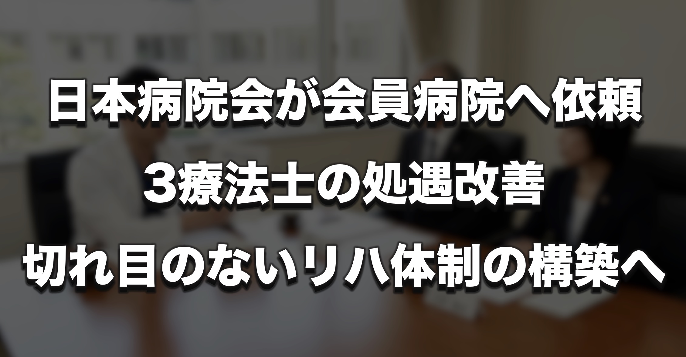 3月2日、一般社団法人日本病院会は、会員病院に対し、「病院に従事する理学療法士、作業療法士及び言語聴覚士の処遇改善と切れ目のないリハビリテーションの提供体制の構築等について(依頼)」と題する通知を発出しました。