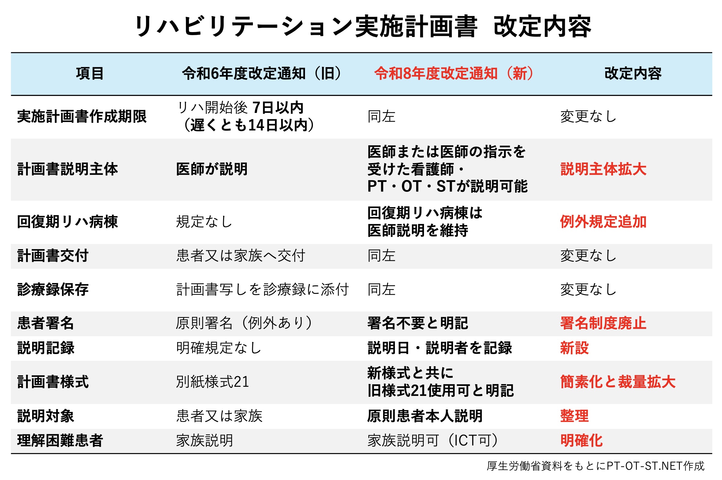 今後は、計画書の説明内容を適切に記録し、患者との情報共有を丁寧に行うことがさらに重要となります。今回の改定は、リハビリテーション医療における多職種の役割を改めて確認する機会にもなると考えられます。