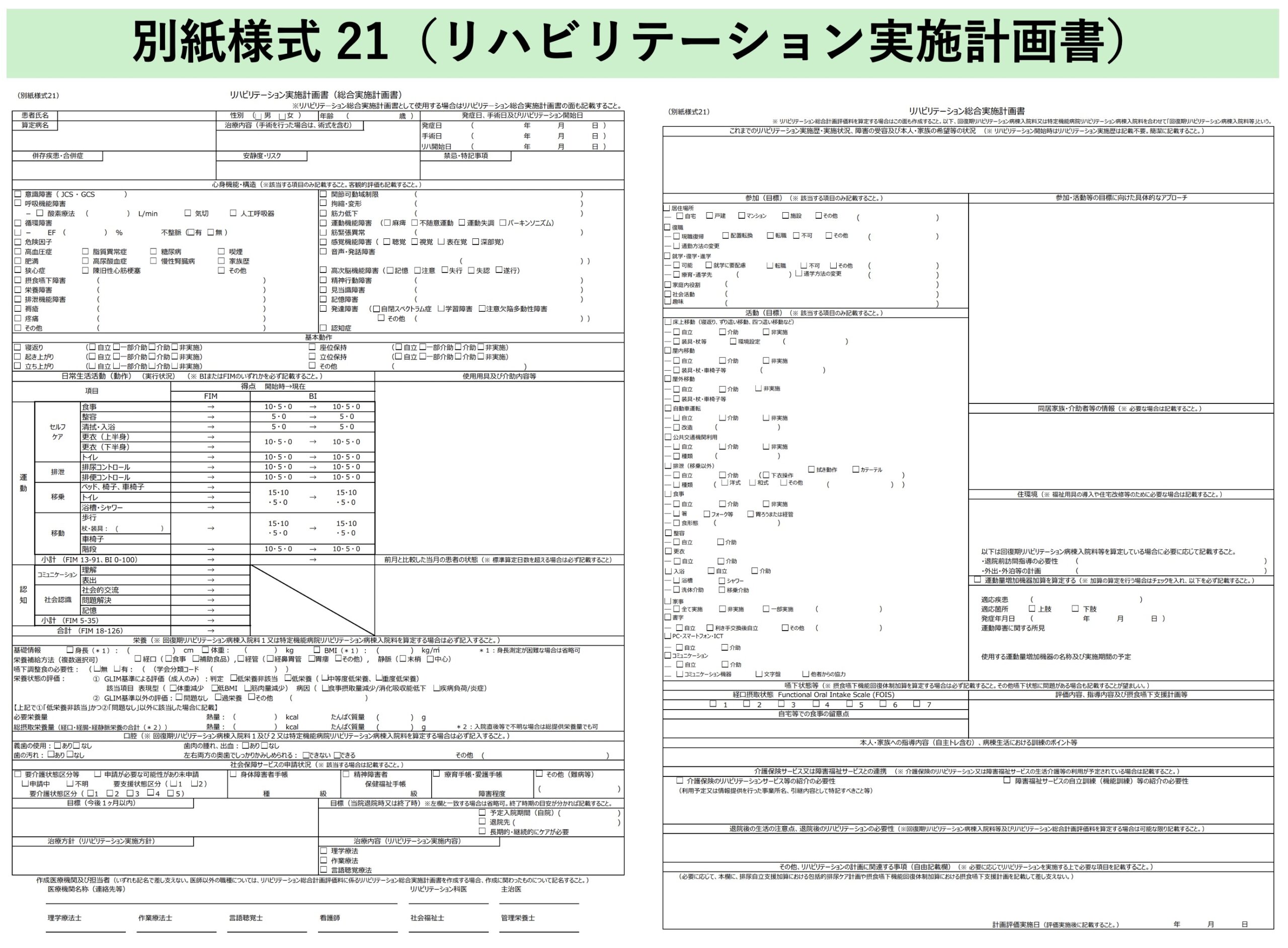 この計画書は、疾患別リハビリテーションの実施において基本となる書類であり、患者の機能評価、目標設定、治療計画などを共有するための重要な役割を担っています。