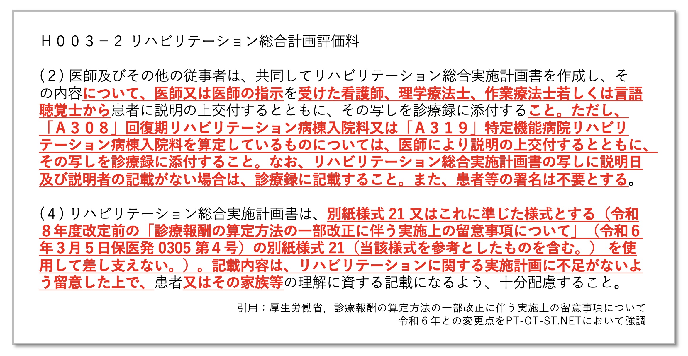 さらに、リハビリテーション専門職が説明主体として制度上明確に位置付けられたことは、PT・OT・STの役割を改めて示すものとも考えられます。