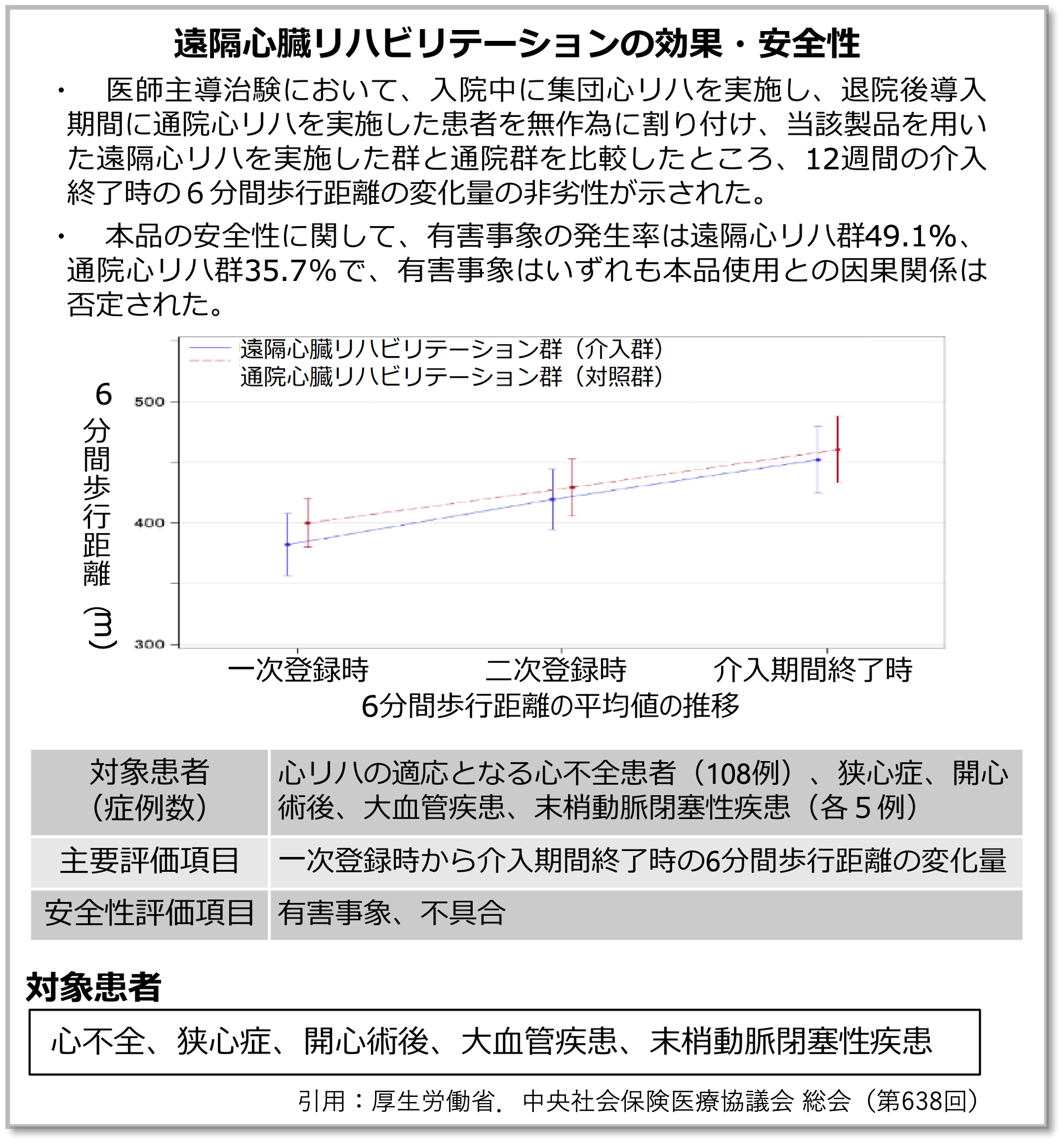 「リモハブ CR U」に関して、薬事承認自体は降りており、6分間歩行距離などの有効性については通院リハビリテーションに対する「非劣性」(許容できる範囲内で劣っていない(同等か、それ以上である)こと)が証明されています。
