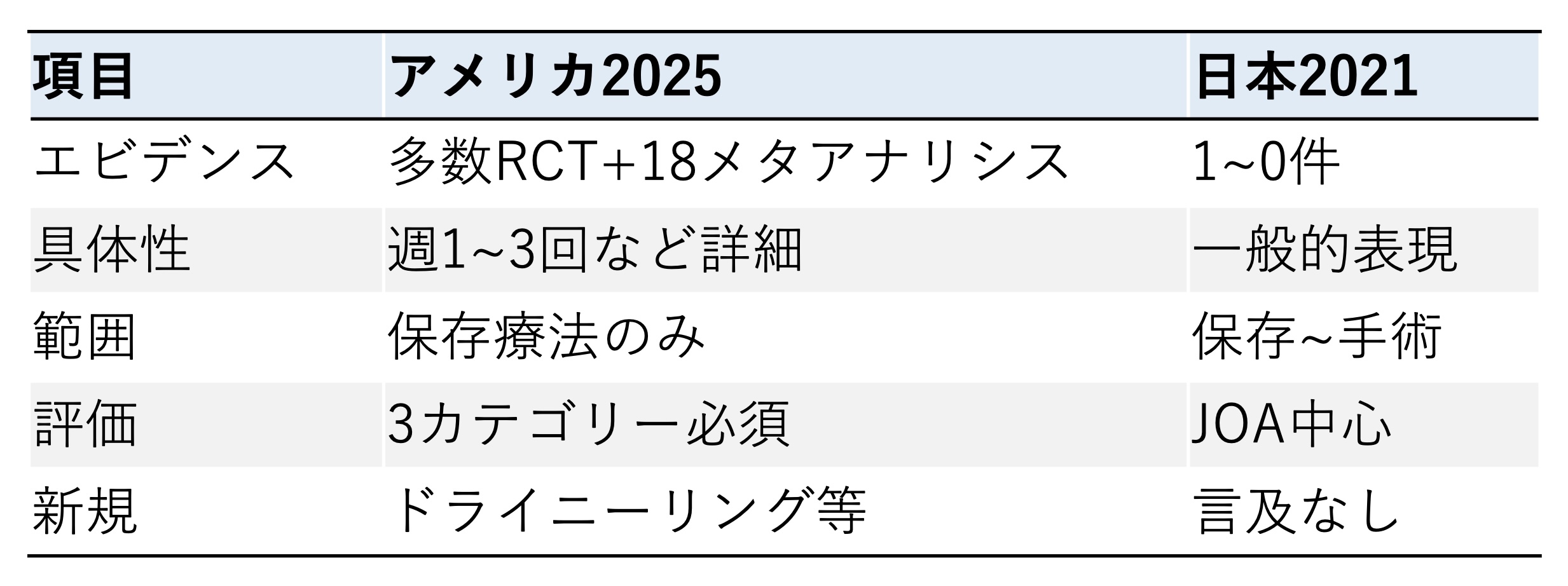 日米比較 | エビデンス量、具体性、範囲、評価、新規介入が異なる