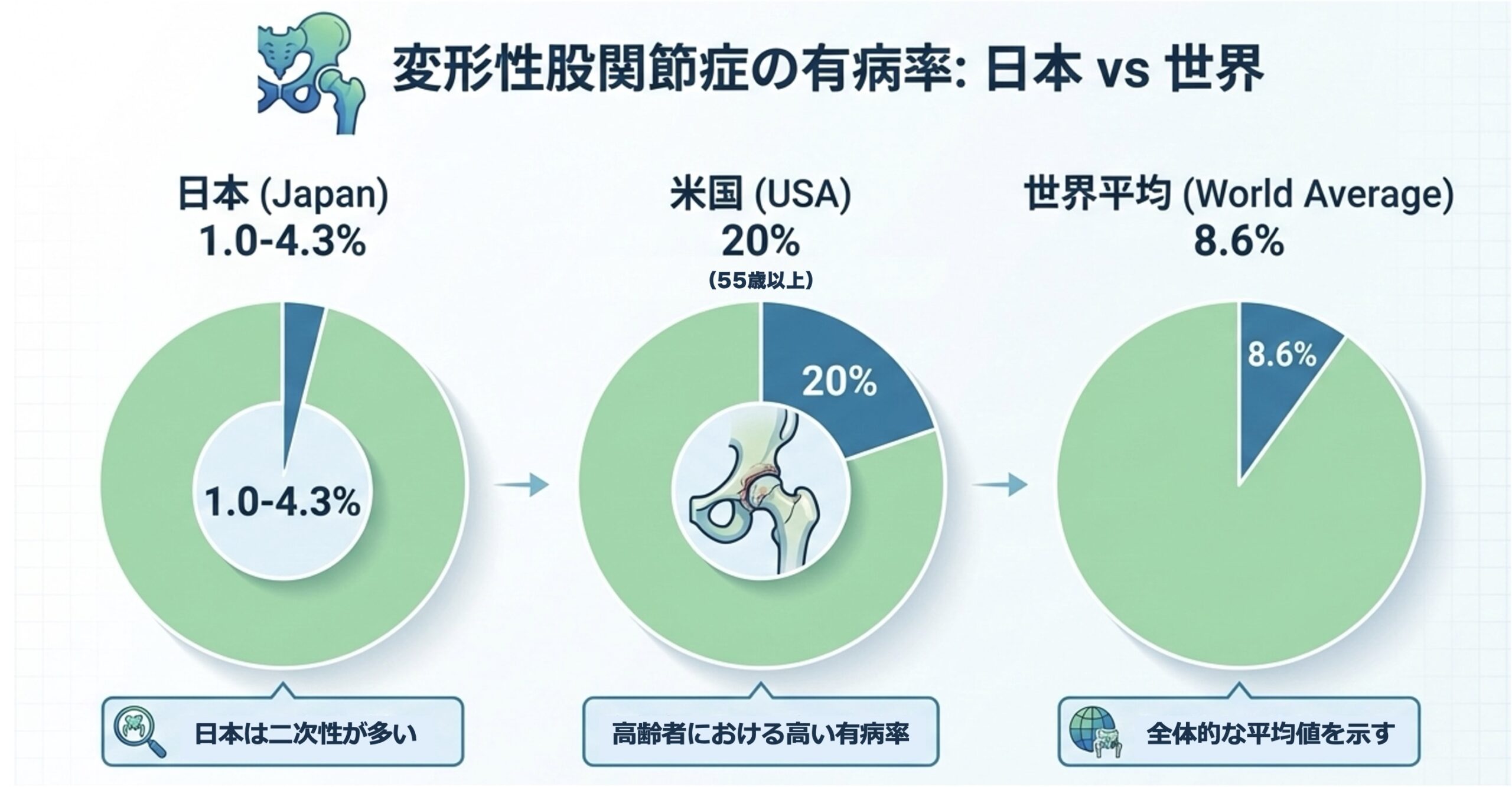 日本における変形性股関節症の有病率は1.0〜4.3%で、女性(2.0〜7.5%)が男性(0〜2.0%)より多い傾向です。発症年齢は平均40〜50歳です。