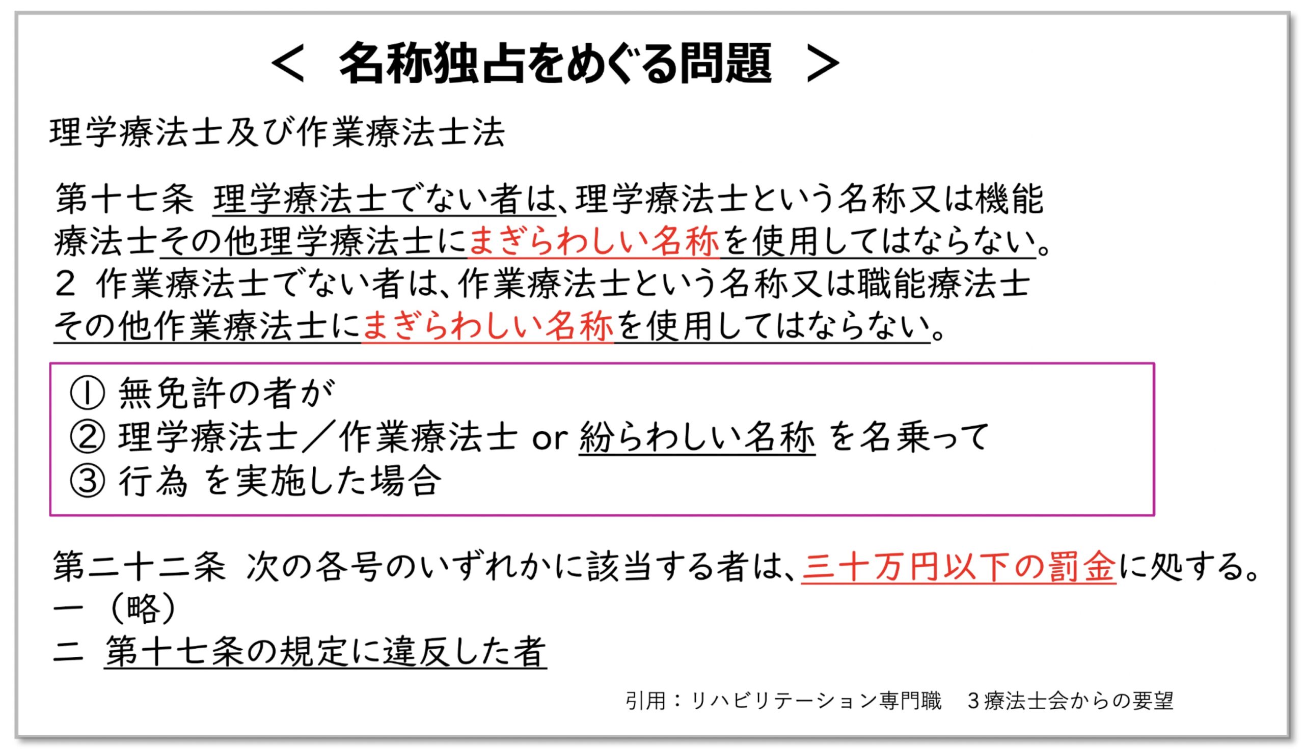 現行の規制では十分な抑止力があるとはいえず、実際に理学療法士に似た名称が横行しているとして、日本の医療の安全性と質の確保に課題があることが示されました。