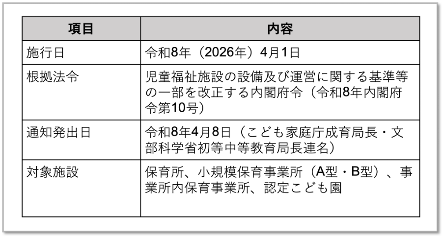 対象は保育所のほか、小規模保育事業所(A型・B型に限る)、事業所内保育事業所、認定こども園にも広げられています。