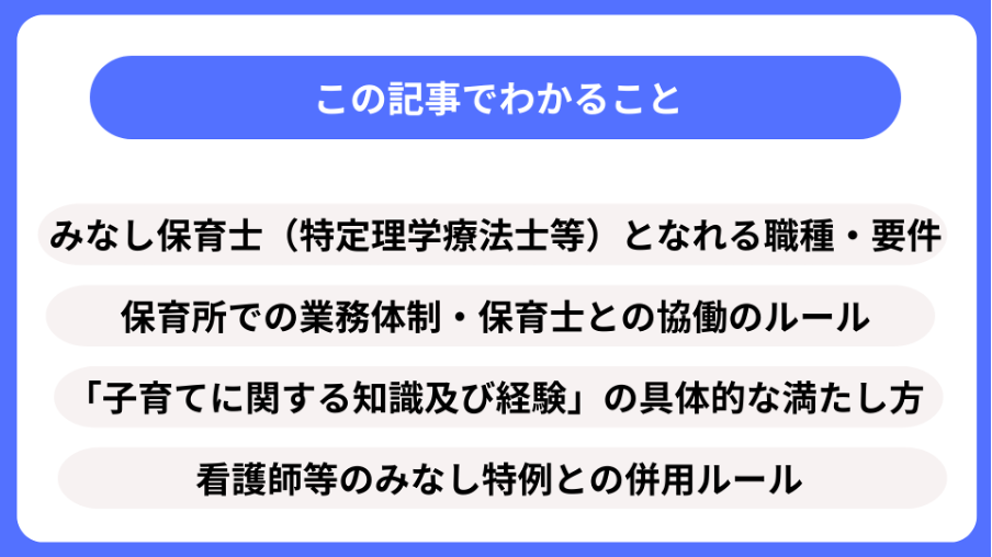 保育所では従来、保健師・看護師・准看護師(以下、看護師等)に限り、1人に限って保育士とみなすことが認められてきました。