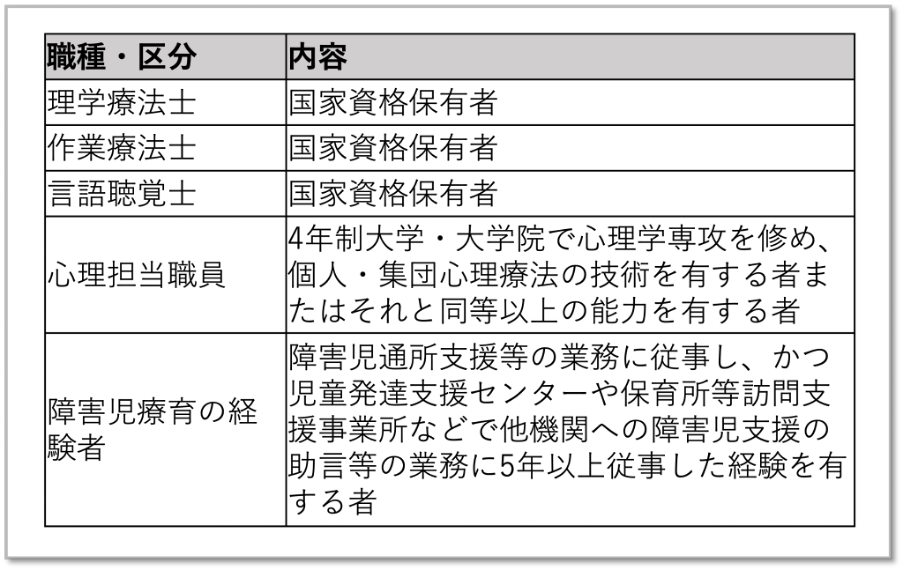 新設された「特定理学療法士等」に該当するためには、以下のいずれかに該当する職種・経験要件と、「子育てに関する知識及び経験」を有するという共通要件の両方を満たす必要があります。