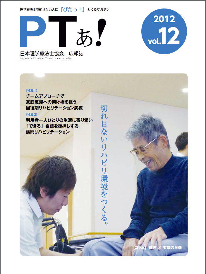 理学療法士協会のPTあ!12号が出来ました。医療から介護へのリハビリ連携が重要となるなかで、病院から在宅でのリハビリを特集。介護保険分野でも理学療法士の役割を理解して頂くために、ケアマネージャ(居宅介護支援事業所)に約2万7千箇所に配布。その他養成校、県士会、行政、関係省庁に配布、ホームページでも公開されてます。