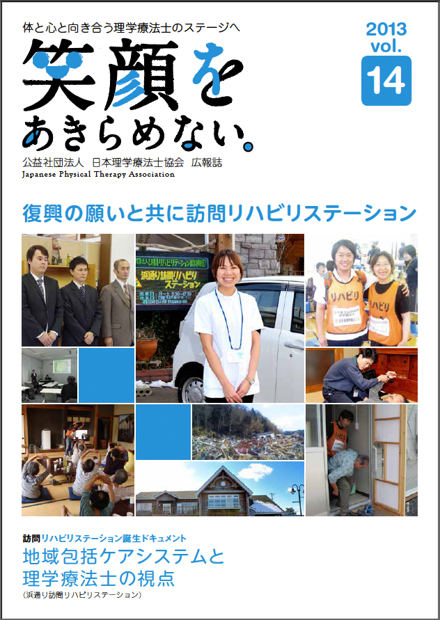 日本理学療法士協会が新たな広報誌「笑顔をあきらめない」を公開しました。広報誌には、日本理学療法士協会が、震災からの2年間、被災ボランティアとしての支援活動、そして、復興特区法で認められた第1号訪問リハビリステーション設立までの取り組みを、訪問リハビリドキュメントして紹介しております。