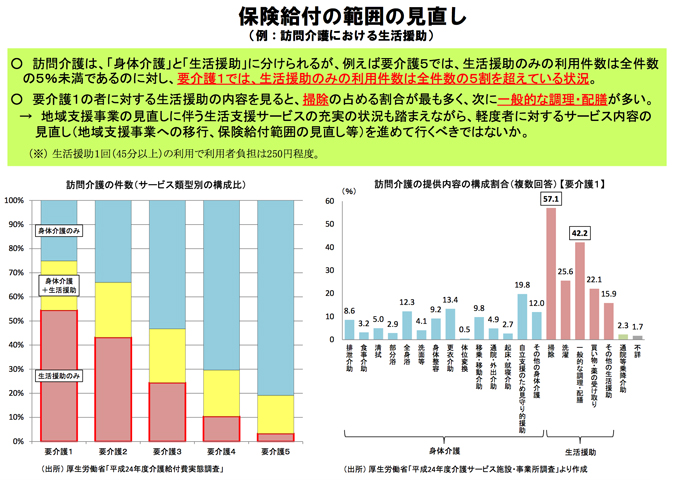 財務省は8日の「財政制度等審議会」で、要支援のみならず要介護1など軽度の要介護者に対する生活援助等を地域支援事業への移行すること、訪問介護・通所介護以外の予防給付についても地域支援事業への移行することを検討していくべきではないかと次期介護保険制度改革に向けたた課題として主張した。