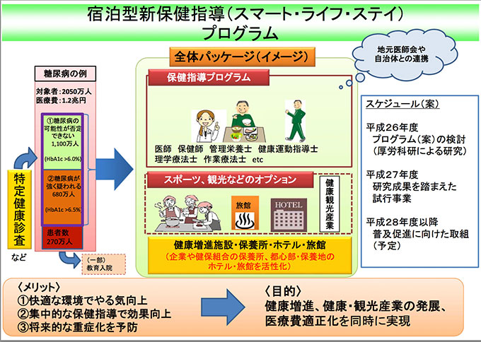 日本再興戦略のアクションプランの一つである戦略市場創造プランにおける、ヘルスケア産業として、糖尿病が疑われる者等を対象に、ホテル、旅館などの地元観光資源等を活用して行う『宿泊型新保健指導プログラム』が試験事業としてスタートする。宿泊型新保健指導(スマート・ライフ・ステイ)プログラムについては生活習慣病を効果的に予防することを目的に、糖尿病が疑われる者等を対象として、ホテル、旅館等の宿泊施設や地元観光資源等を活用して保健師、管理栄養士、理学療法士、作業療法士、健康運動指導士等が多職種で連携して提供する新たな保健指導プログラムとなる。今後は試行事業等を経た上で、その普及促進を図る予定。