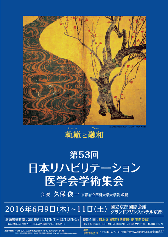 第53回日本リハビリテーション医学会学術集会は2016年6月9日(木)〜11日(土)国立京都国際会館とグランドプリンスホテル京都で開催されます。メインテーマは「軌轍 Kitetsu と融和 Yuwa」です。先人の軌轍から生み出された知識や知恵を基にして各分野間の融和をはかり、リハビリテーション医学が飛躍できるようにとの願いを込めています。リハビリテーションの基礎から最先端までの知識を系統立てて学べる多彩な企画を予定しています。各関連専門職種との共同企画をはじめ、特別講演や教育講演を過去最大規模でご用意しております。