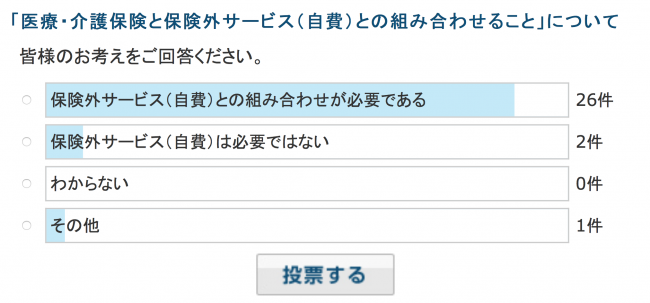 保険内・外のサービスを一体的に提供できるルールに変えたうえで、公定価格より高い値段を設定できるようにすべきとの声が挙がっている。満足度の高いサービスを提供するために、公的保険外サービスも組み合わせて介護報酬を上回る料金を定めることを認めることを提案。この提案が実現すれば、訪問介護の現場で認められていなかった同居家族の食事の支度や洗濯などが、追加徴収した上で一体的に提供することが可能になる。