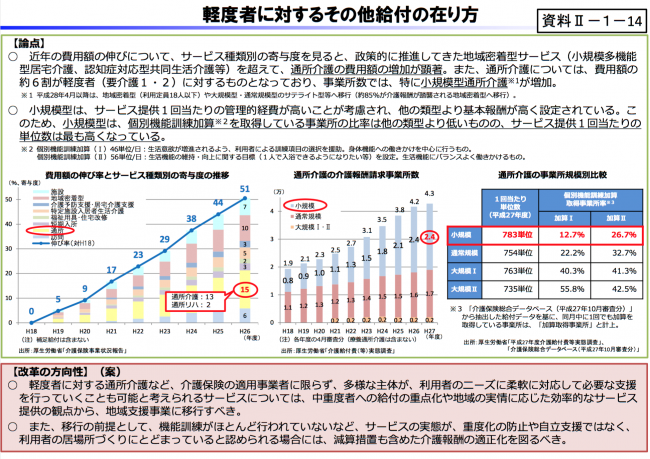 軽度者に対する通所介護などについては、中重度者への給付の重点化や地域の実情に応じた効率的なサービス提供の観点から、地域支援事業に移行すべきである。また、その前提として、機能訓練が殆ど行われていないなど、サービスの実態が、重度化の防止や自立支援ではなく、利用者の居場所づくりにとどまっていると認められる場合には、減算措置も含めた介護報酬の適正化を図るべきである。