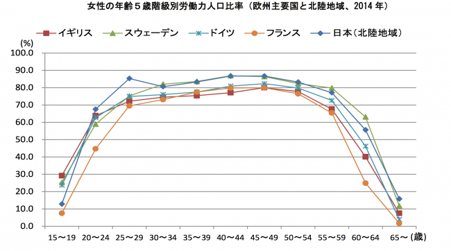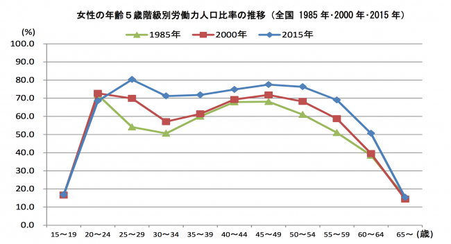 男女雇用機会均等法が制定された1985年の女性の年齢階級別労働力人口比率のグラフを見てみると、20歳代前半と40〜50歳代の労働力人口比率が高く、出産から子育てを担う25〜29歳及び30〜34歳で比率が低い、いわゆるM字型のカーブを描いていた。一方、30年後の2015年のグラフをみると、1985年にM字カーブの底であった30〜34歳の比率が約20ポイント上昇し、M字カーブの谷はかなり浅くなり、M字カーブは解消される傾向があることがわかる。安倍政権が発足し、女性活躍社会が推進され働く女性が増えている傾向がわかる。また、60歳以上のシニア世代も労働参加率が高まっていることもわかる。