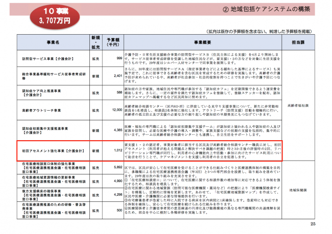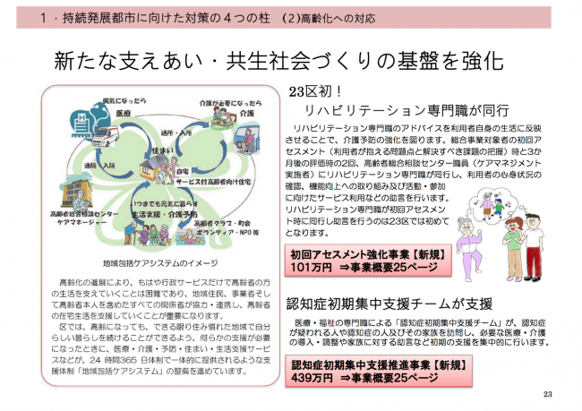 また、豊島区は新たな支えあい・共生社会づくりの基盤を強化として、初回アセスメント(利用者が抱える問題点と解決すべき課題の把握)時にリハビリテーション専門職が同行する「初回アセスメント強化事業」も新規で100万円の予算計上をしており、実現すれば東京都23区初のモデル事業となる。