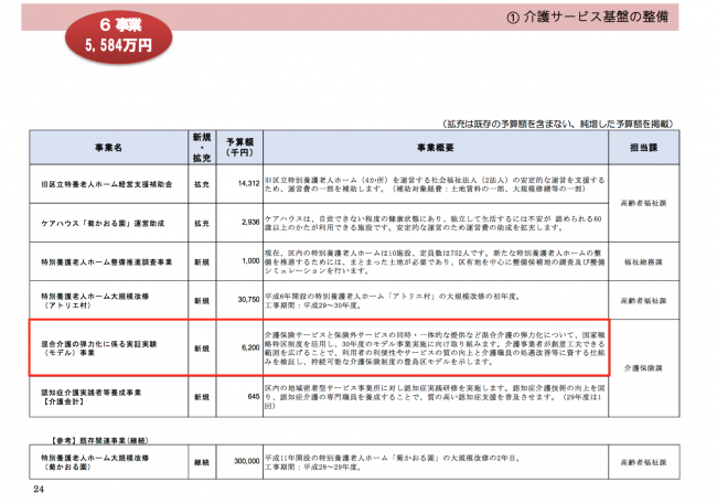 東京都豊島区は平成29年度予算案重点事業の中で、介護保険サービスと、家事などの保険外サービスを組み合わせる「混合介護」を、国家戦略特区制度を利用して実施する方針を示している。サービス提供の仕組み作りに予算約600万円を計上。実現すれば、豊島区が「混合介護」を導入した全国初の自治体となる。