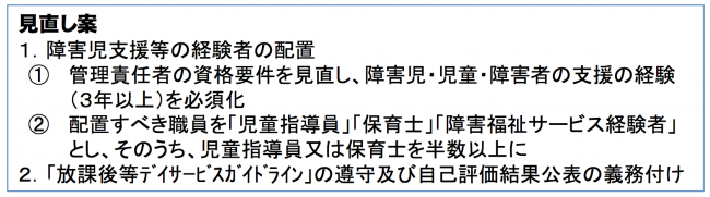 放課後デイサービスの事業所数が大幅に増加しており、費用は障害児支援全体の64.9%を占める状況になっている。厚生労働省は平成29年4月から人員基準を見直し放課後デイサービスの適正化を図る。また、放課後デイサービスでは利潤を追求し、テレビを見せているだけ、ゲーム等を渡して遊ばせているだけなどの支援の質が低い事業所が増えているという指摘があり、自己評価を義務付け運用の適正化も進められる予定となっている。