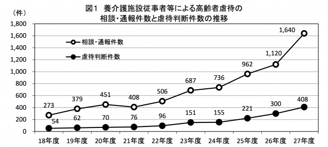 介護職員による虐待件数が408件と過去最多値となった。また、介護職員による通報、相談件数も1,640件と約5割増。高齢者の世話をしている家族、親族、同居人等による虐待件数は15,976件と前年比1.5%であった。