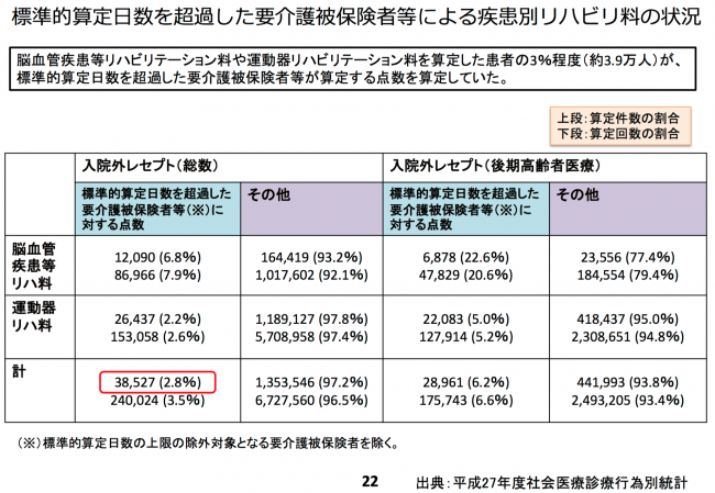 介護保険への移行に当たって、リハビリテーションにかかる施設基準の違いや、医療保険とは別の事務手続の存在が障壁となるとの指摘がある。