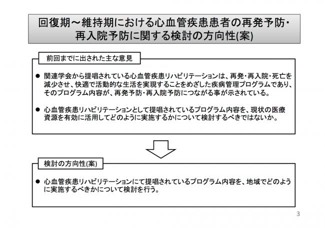 厚生労働省は19日、心血管疾患に係るワーキンググループの中で、心血管疾患患者の再発予防・再入院予防・死亡を減少させるため、疾病管理プログラムとしての心血管疾患リハビリテーションを地域の医療資源を効率的に用いて、多職種が連携できる体制の検討を提案した。