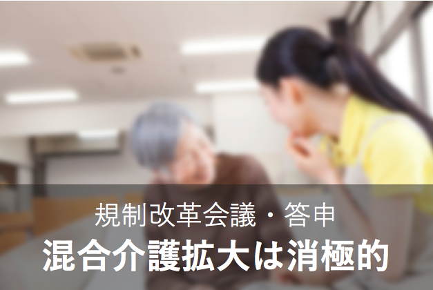 規制改革推進会議では、本人や家族のニーズに合わせて保険内サービスと保険外サービスを柔軟に組み合わせられるようにし、介護サービスの質と利用者満足度が向上、また、介護事業の効率化や介護職員の処遇改善につなげように改革を推進してきた。その際に生じるであろうデメリットについては防止、また、極小化するための制度上の工夫を示し、事業者や地方公共団体が遵守すべき「標準ガイドライン」を、平成29年中に策定することを改革の方針としてきた。しかしながら、5月23日の規制改革推進会議における答申では、「標準ガイドライン」策定と言った具体的な内容は含まれず、混合介護の拡大については骨抜き状況となった。