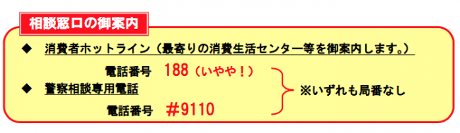 消費者庁は、不審な電話が掛かってきたり、おかしなことに巻き込まれたと感じたりした場合は、 まずは一人で抱えこまず、信頼できる周囲の人、消費者ホットライン(電話番号:188)や警察 (電話番号:#9110)に相談して欲しいとしている。