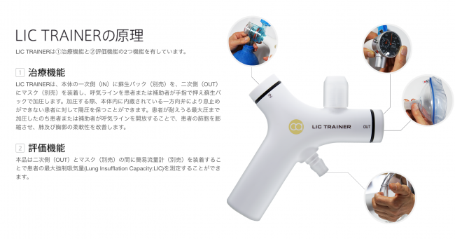 しかし、MICは息止め能力が不可欠であるため、陽圧に慣れていない患者や球麻痺を呈するALS患者、また気管切開をした患者等の呼吸障害が進行した患者には実施できないという課題があった。今回、開発された「LIC TRAINER」は息止めができなくても内蔵されてる一方向弁があることでMIC以上の効果が得られるとしており、安全かつ幅広い患者に使用されることが期待される。
