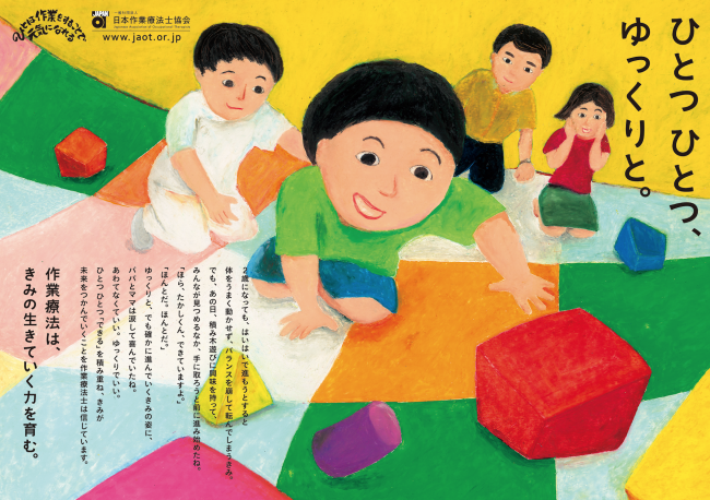 日本作業療法士協会は毎年、作業療法啓発ポスターを制作し、都道府県作業療法士会を通して全国に配布している。2017年の啓発ポスターでは、子どもにとっては遊ぶことも作業療法のひとつであり、積木遊びに夢中になっていたら、今までできなかったことができたという場面想定を通して、子どもに対する作業療法場面を紹介している。