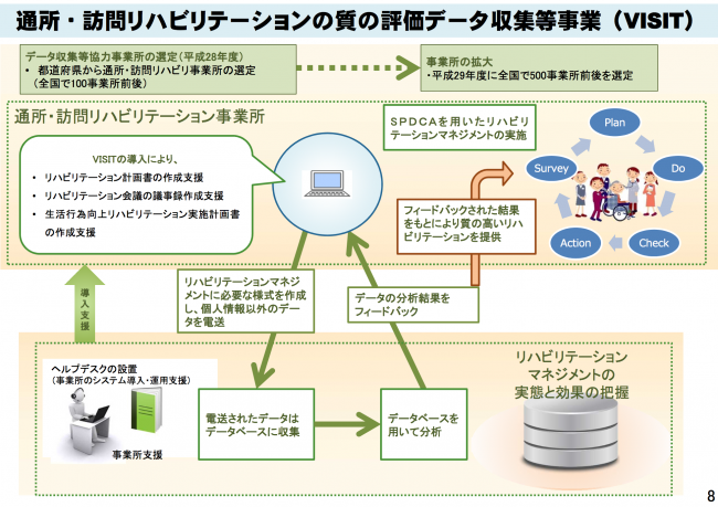 厚生労働省は、現行のリハビリテーションマネジメント加算(Ⅱ)の見直しとして、「リハビリテーションマネジメント加算等に使用する様式のデータを、通所・訪問リハビリテーションの質の評価データ収集等事業に参加し、同事業で活用しているシステム(VISIT)を用いて提出し、フィードバックを受ける」ことを評価する要件を提案した。