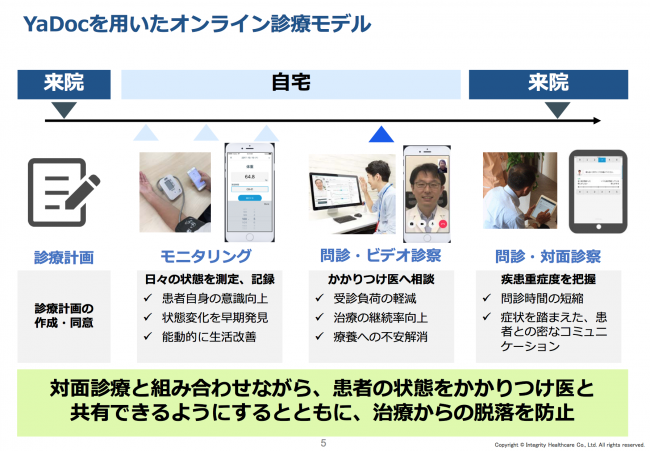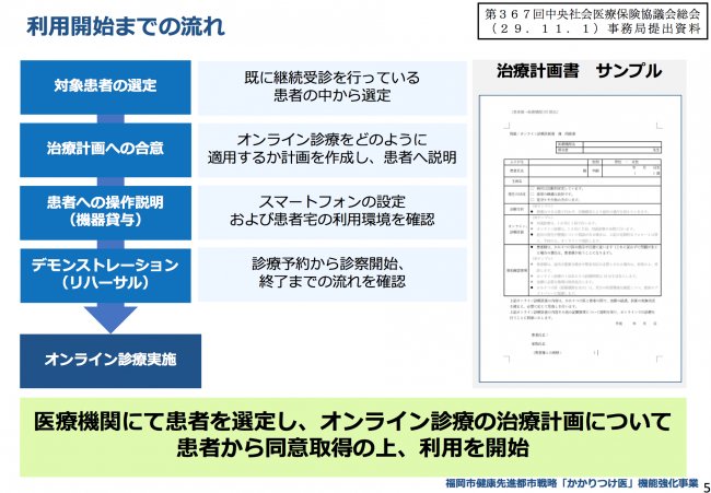 同会議では、遠隔診療の先行事例として福岡市健康先進都市戦略『かかりつけ医』機能強化事業を紹介。オンライン診療をどのように適用するか治療計画書を作成し、患者へ説明することが利用開始までの流れに組み込まれている。