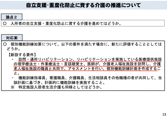 15日に開催された介護給付費分科会の中で、介護老人福祉施設や短期入所生活介護事業所の職員と外部のリハビリ専門職が共同でアセスメントし、個別機能訓練計画を作成することを新たに評価する方針が示された。