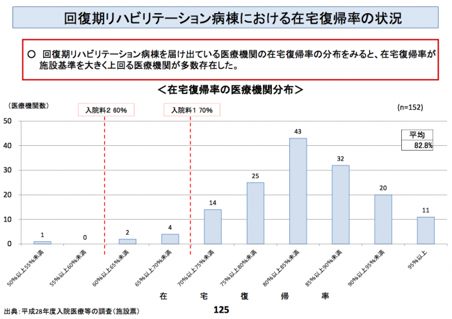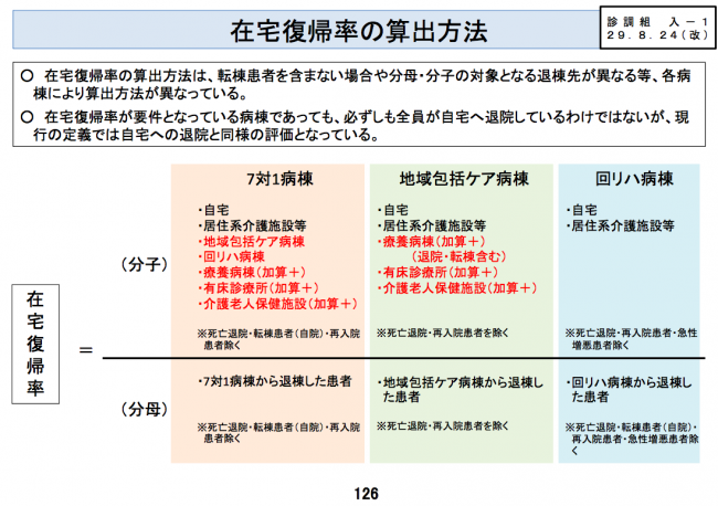 さらに、現行の在宅復帰率は計算式の分母・分子の対象となる退棟先が各病棟により異なるなど算出方法に差が生じているため、評価対象の見直しも検討されている。