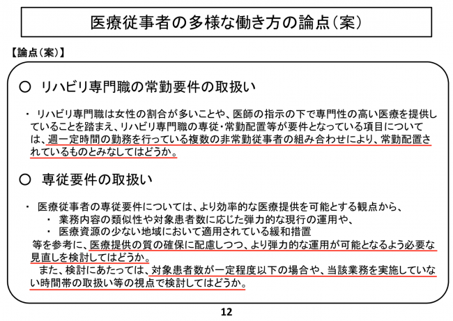 中医協で、リハビリ専門職の常勤要件の取扱いとして「週一定時間の勤務を行っている複数の非常勤従事者の組み合わせにより、常勤配置されているものとみなす」方針が示された。
